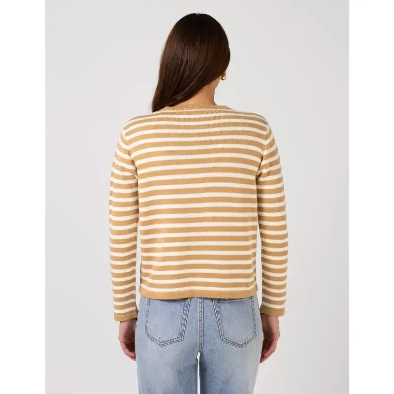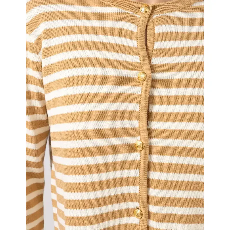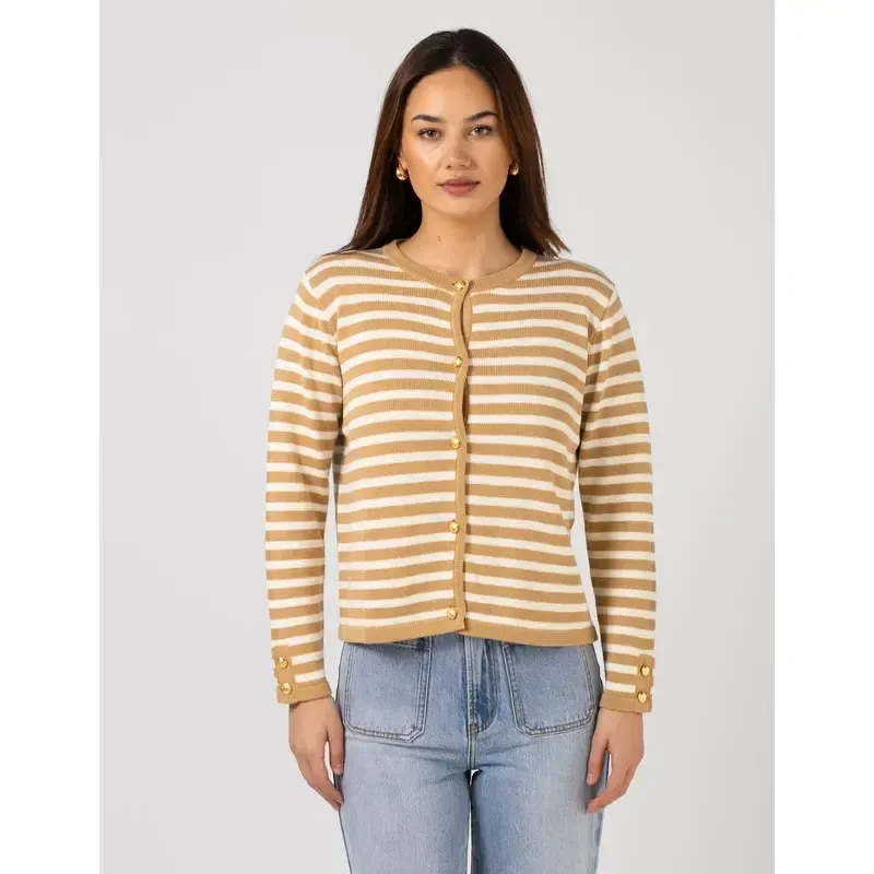 Button front stripe cardigan with gold contrast buttons on front placket and cuffs.