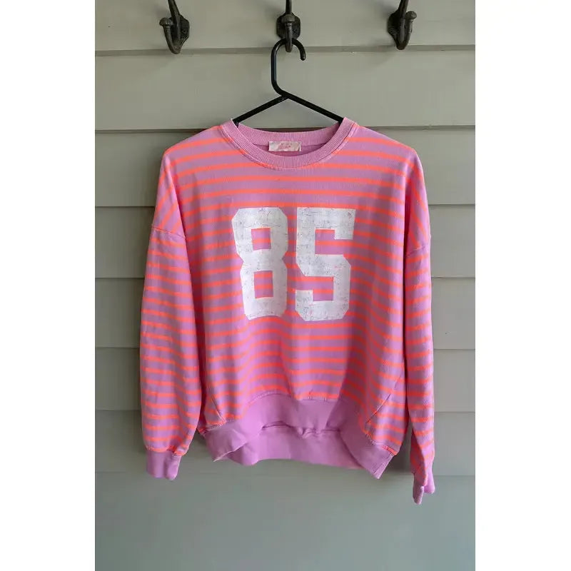 The LUNA Sweat is a lightweight jumper, made from 100% cotton for all seasons. Both sporty and stylish, this graphic sweatshirt features a distressed print of the number 85. A bold and colourful striped base of pink and neon orange will bring a playful energy to your weekend wardrobe!