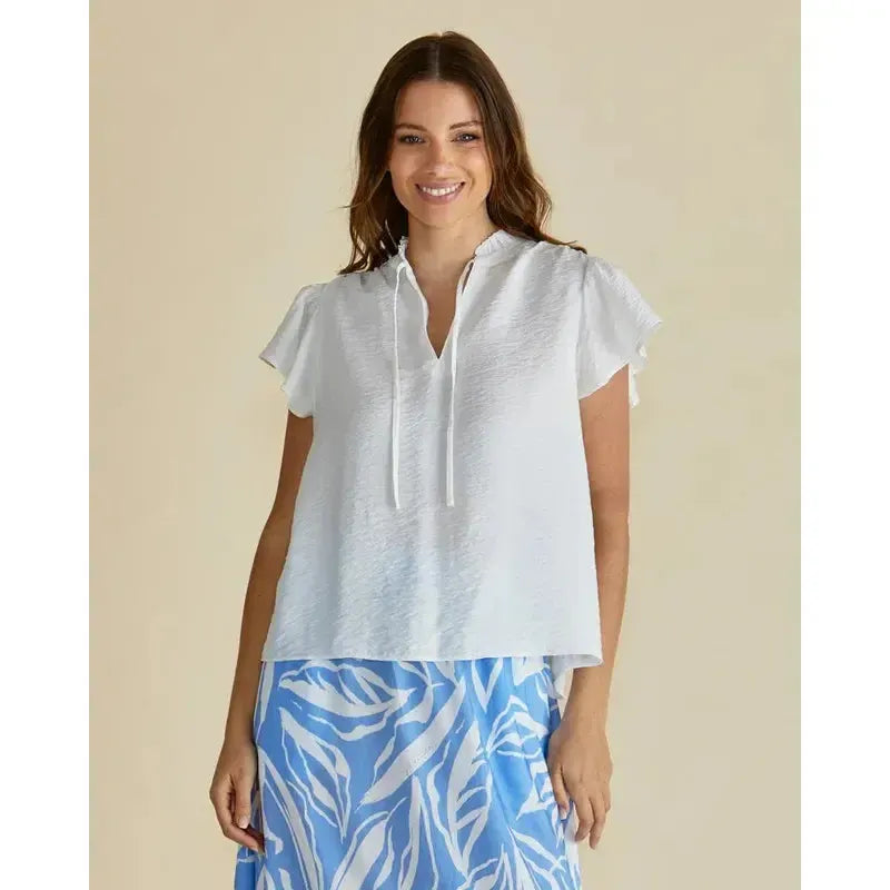 The Lyra Blouse blends romantic detail with everyday ease. Featuring a round keyhole neckline with a tie-up, flutter sleeves and frilled collar detailing, it offers a soft, elevated look. Shirred panels create gentle texture, while the relaxed fit ensures all-day comfort. Effortless and timeless, it’s a transeasonal favourite.