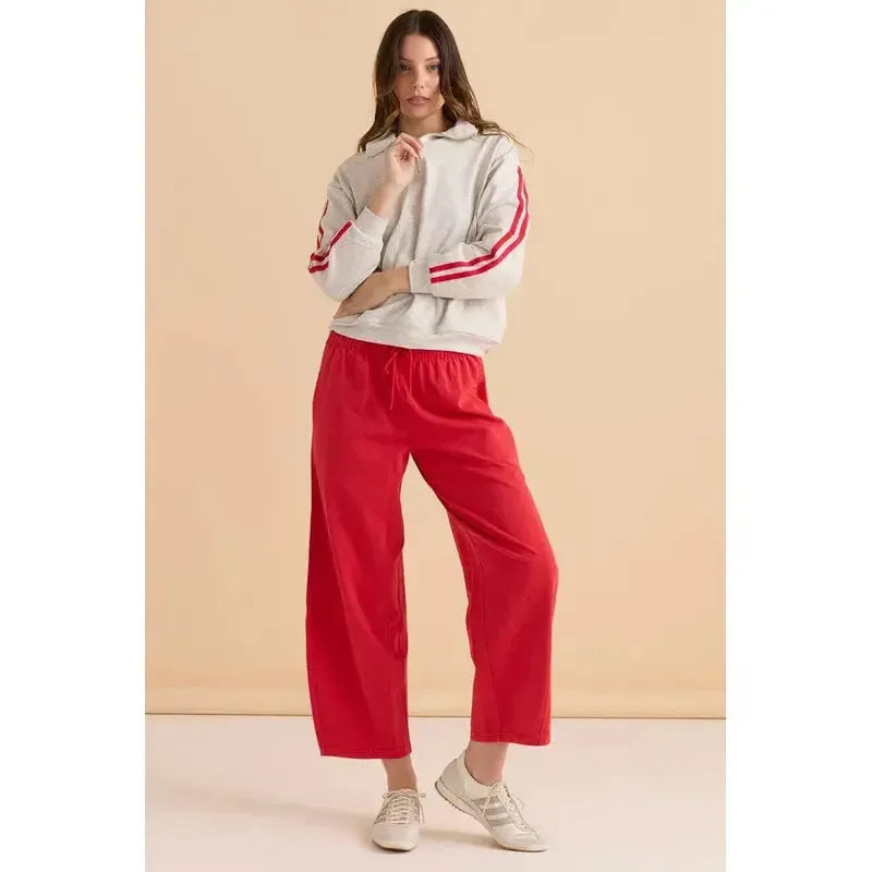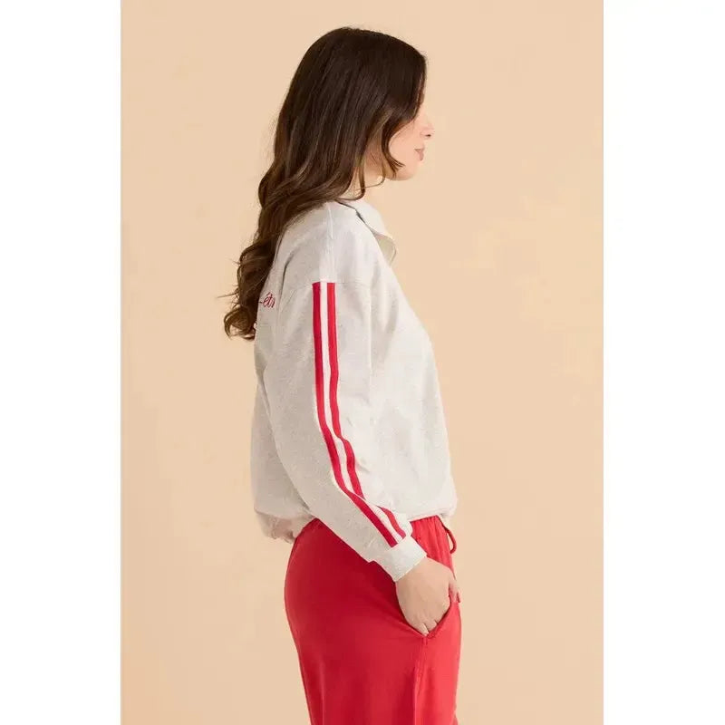 A soft fleece sweatshirt with an elevated sporty feel. The half-zip neckline brings versatile styling. Contrast stripe sleeves and embroidery add a refined finish. A relaxed essential for casual comfort.