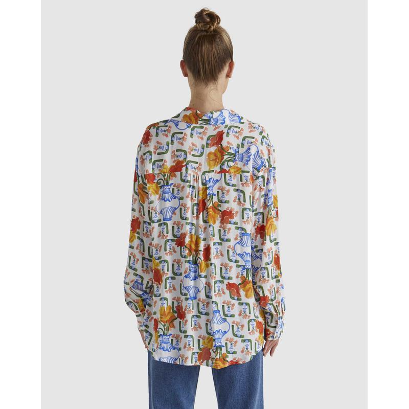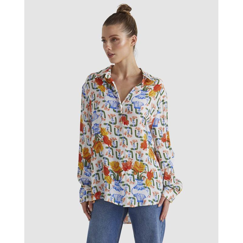 The Summer Tide Shirt features a collared neckline with an open front and long sleeves for a modern yet timeless vibe. Gold metal buttons add a refined touch to this effortlessly chic design.