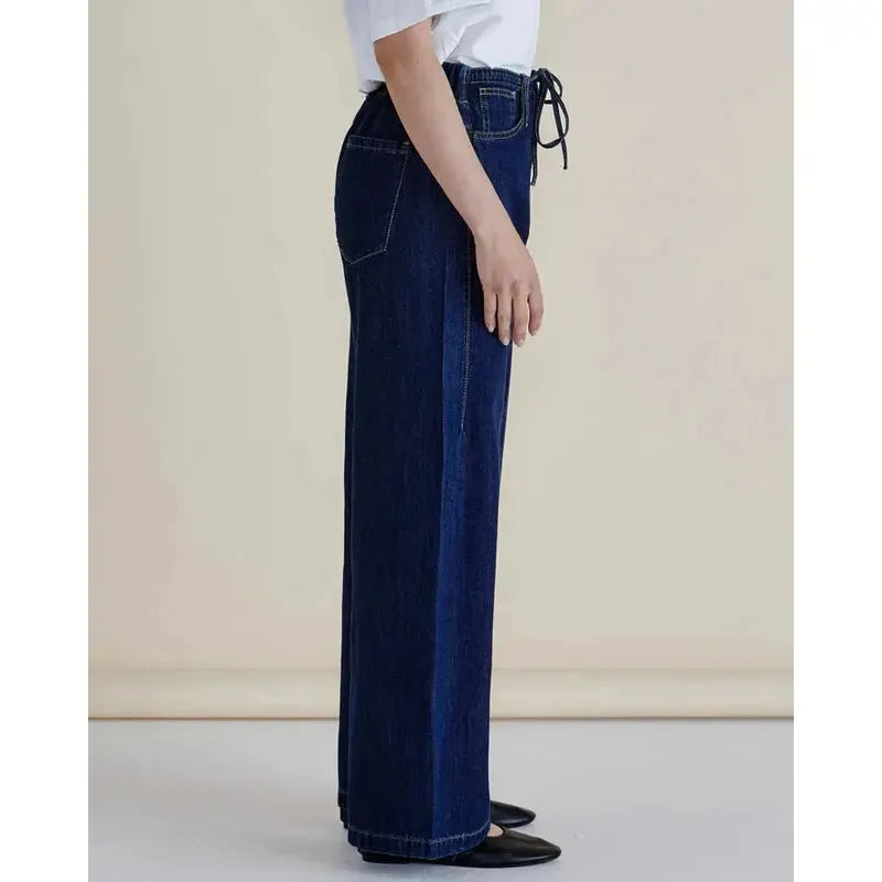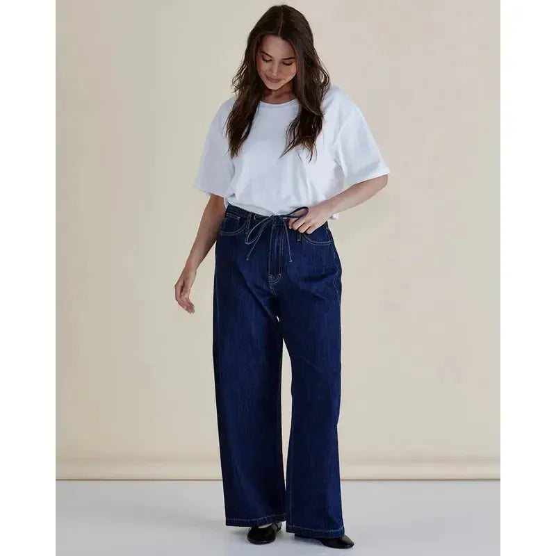 Goldie Jeans provide a sophisticated take on classic denim with a mid-high rise, elasticated back, and front waist tie. Their polished fit balances comfort and style for timeless appeal.