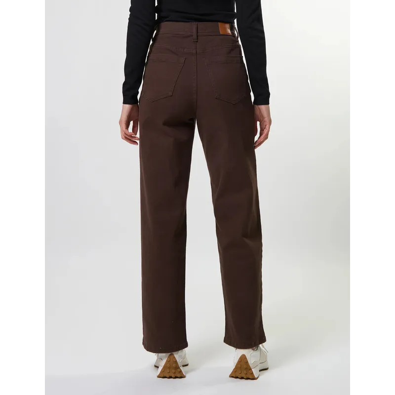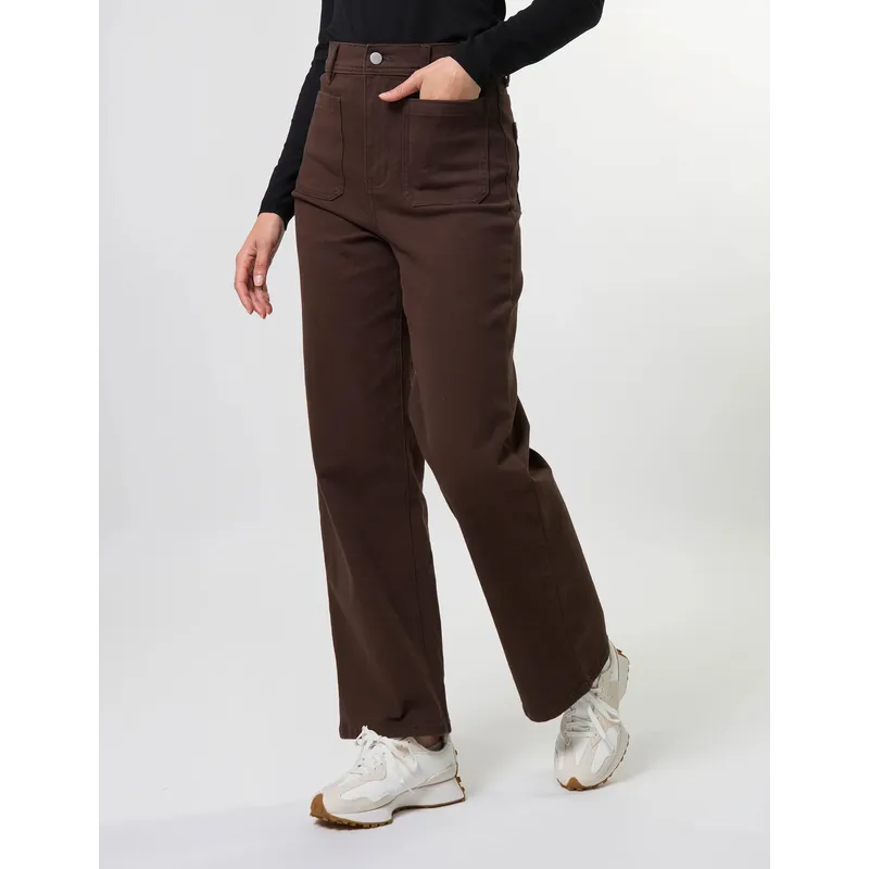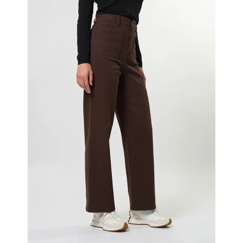 Wide leg full length jean with front patch pockets, back pockets and logo patch on back waistband.