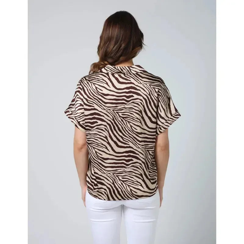 V neck collared blouse with large novelty button and concealed placket. Cuffed sleeves.