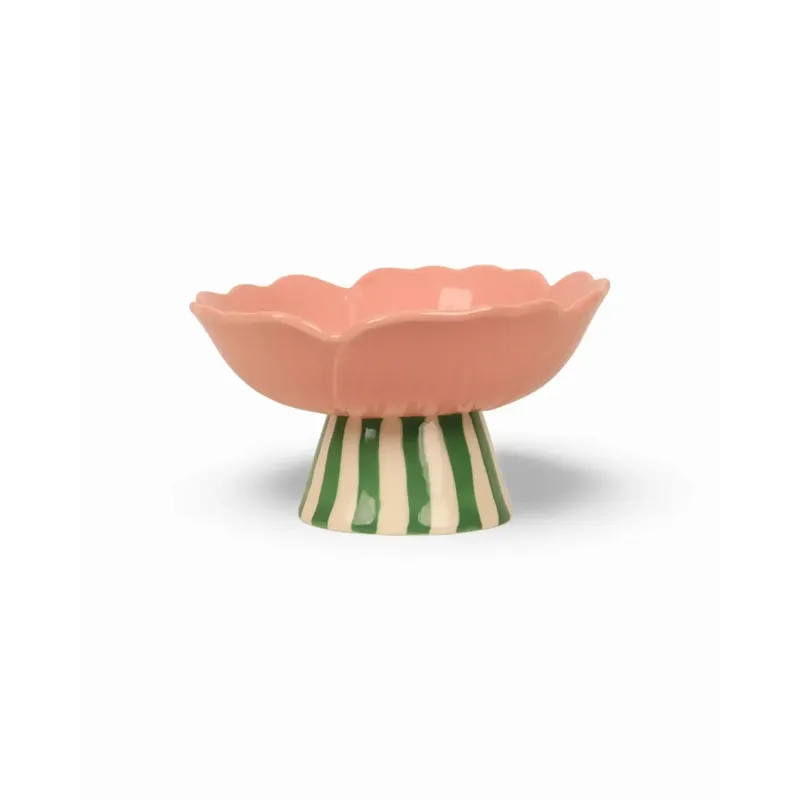 Shaped like a blooming flower, this stoneware bowl features gently fluted edges and hand-painted detailing in warm blush tones, finished with vibrant green striped raised stand, for an unexpected pop of contrast.