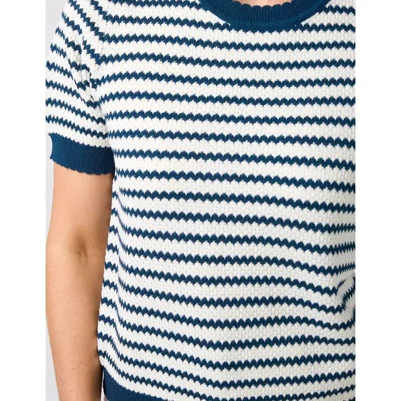 Crew knit knit top with curved stripe design and scalloped edges on neckline, cuffs and hem.