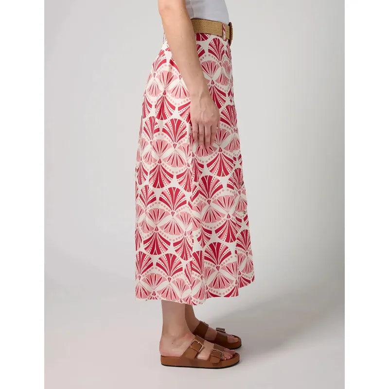 Ankle length A line button front skirt, with flat front waist and back elasticated waist. Removeable contrast raffia belt and buckle and side angle pockets.