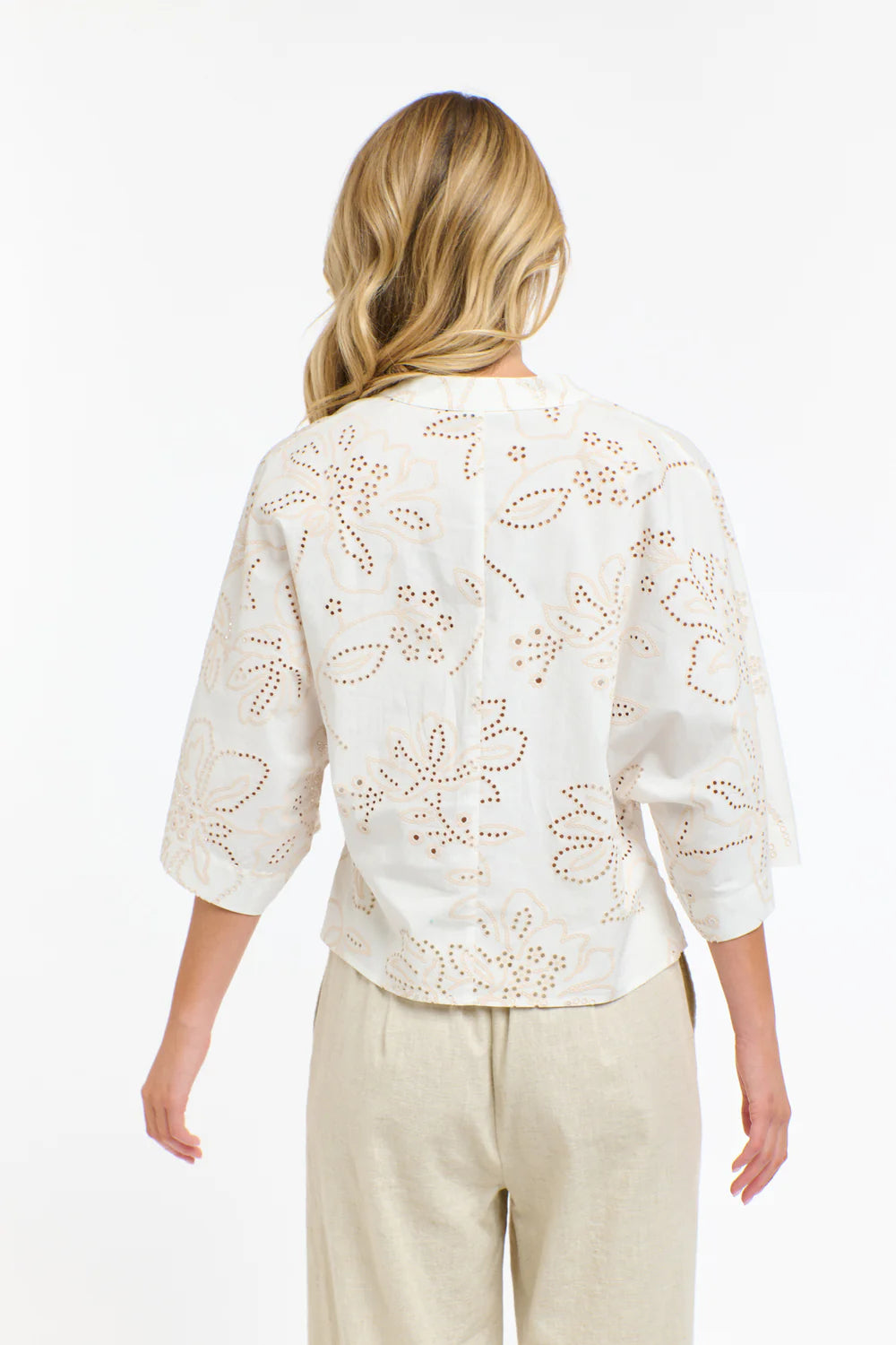 A study in airy detail, the Lana Wide Sleeve Top balances relaxed shape with feminine broderie. The wide, elbow-length kimono sleeve and easy body keep it light and breezy, while the V-neckline adds a clean, flattering line. Pair with linen pants or light denim to let the cutwork pattern take the lead.