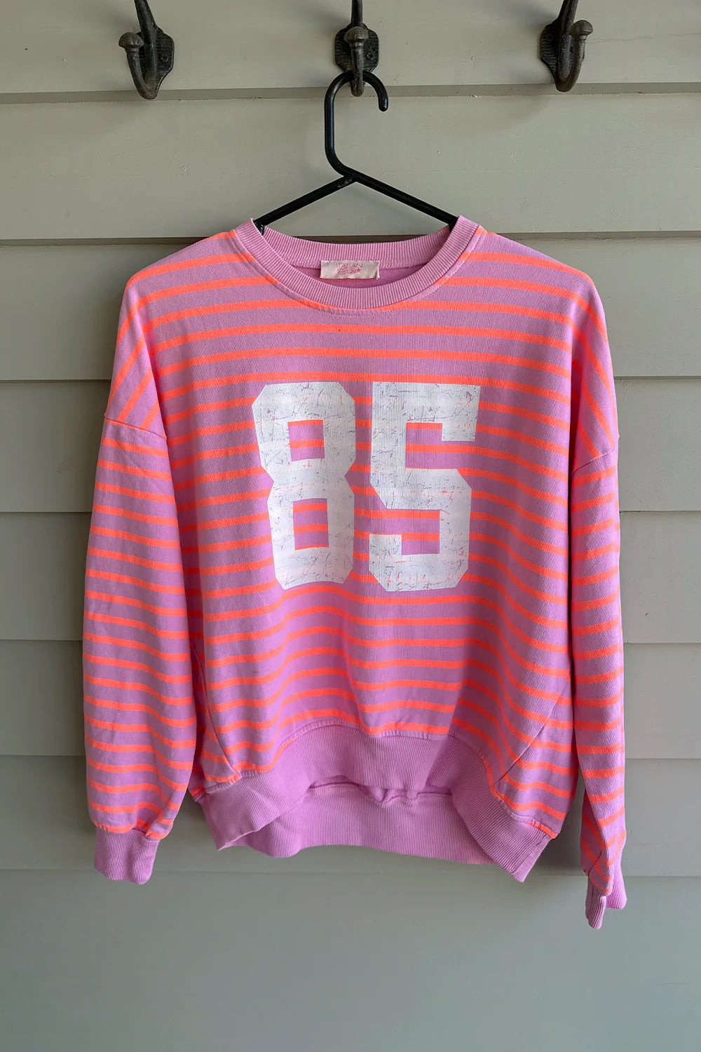 The LUNA Sweat is a lightweight jumper, made from 100% cotton for all seasons. Both sporty and stylish, this graphic sweatshirt features a distressed print of the number 85. A bold and colourful striped base of pink and neon orange will bring a playful energy to your weekend wardrobe!