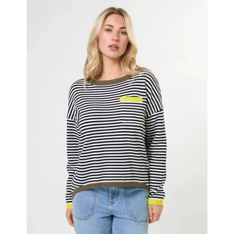 Lightweight jersey knit with contrast colour trims. Crew neck, chest pocket, dropped shoulder and slightly hi lo hemline.